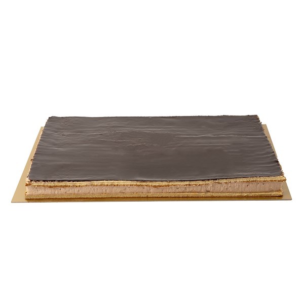 Plancha de jugoso bizcocho rellena de trufa y cubierta con espejo de chocolate.